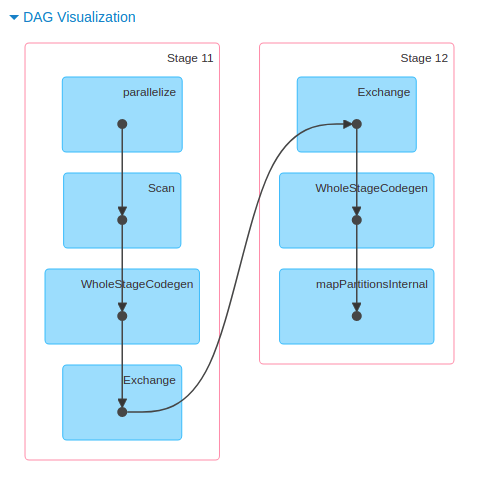 There is also a visual representation of the directed acyclic graph (DAG) of this stage, where vertices represent the RDDs or DataFrames and the edges represent an operation to be applied.